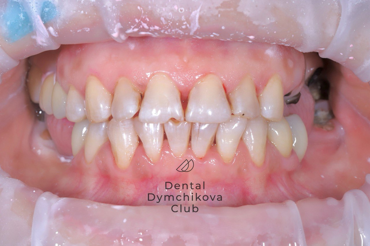 Лечение: удаление старых пломб, обработка от кариеса, снятие слепков, временные коронки, через 2 недели - установка шести вкладок.
